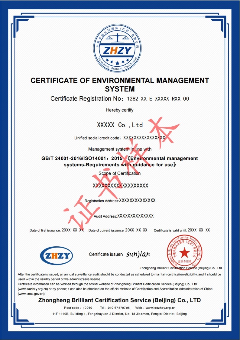 环境管理体系认证证书样本-中文